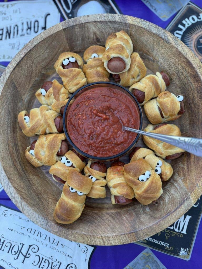 An all-time Halloween fave. Wrap mini sausages in crescent dough like bandages, bake until golden, then drizzle with ketchup or marinara for the blood.
