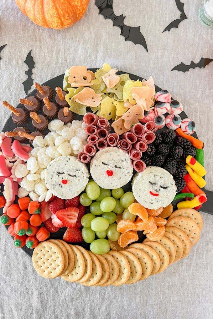 Your regular snack board but with all the spooky drama. Ghost cheese, olive spiders, bat crackers.