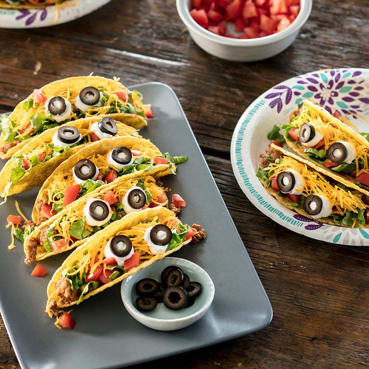 Mini tacos filled with your fave toppings and topped with a big sourcream olive eyeball on top.