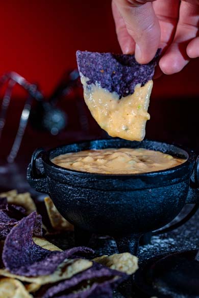 Okay this one’s a little dramatic but totally worth it. It’s just a big bubbling pot of cheese dip with purple nachos or punch with dry ice for the effect.