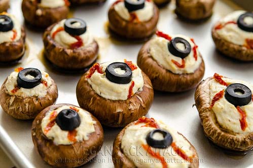 Stuffed mushrooms with a cheesy herby mix, then top with a sliced olive and a dab of hot sauce to make them look like eyeballs. They’re creepy in the best way.