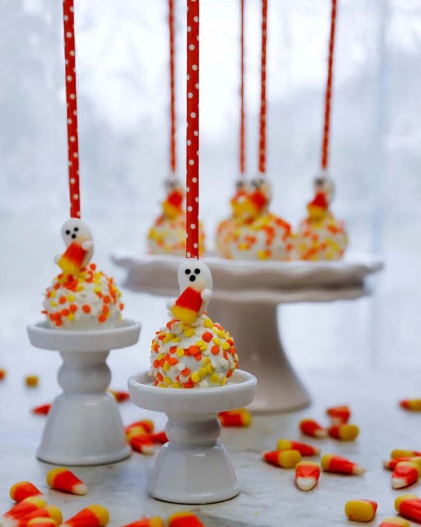Dip cake balls into white, orange, and yellow melts, and boom Halloween perfection on a stick.