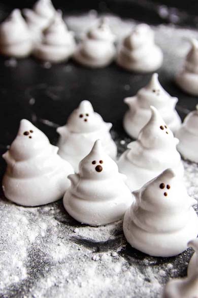 Pipe meringue into ghosty shapes, bake until crisp, then add mini chocolate chip eyes.