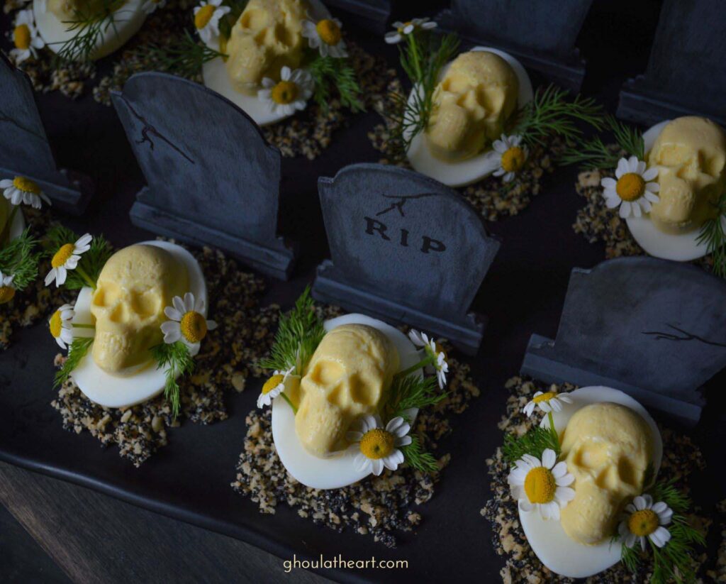 Black-dyed eggs with bright yellow yolk filling, topped with little RIP signs or creepy dirt made from crushed black sesame or olives.