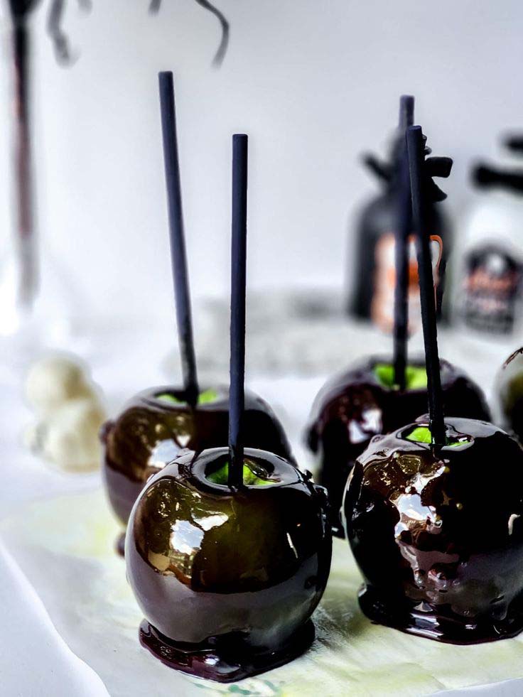 Dip apples in dark red or black-tinted caramel and let them set into spooky perfection.
